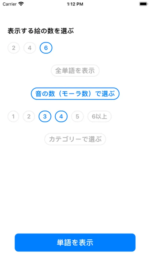 モーラ数(音の長さ)または意味カテゴリーを指定し単語一覧を表示(指定しないと全単語表示) → 一覧からさらに個別に単語を絞り込み