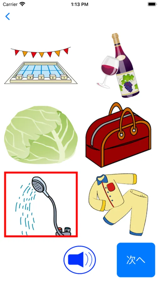 スピーカーボタンを押すと音声が流れるので、聞こえた単語を表す絵の中から選びます。正解・不正解が表示され、不正解の場合は正解を見ることができるとともに、再度音声を聞くことができます。10回1セットで、1セットごとに10点満点中の得点が表示されます。