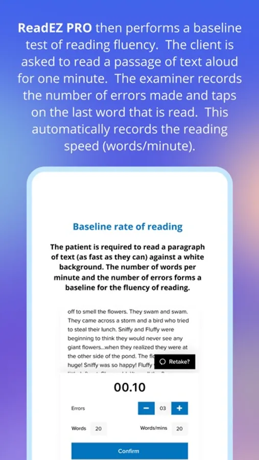 ReadEZ PRO then performs a baseline test of reading fluency. The client is asked to read a passage of text aloud for one minute. The examiner records the number of errors made and taps on the last word that is read. This automatically records the reading speed (words/minute).