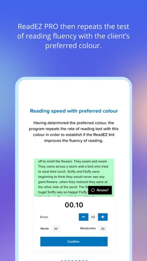 ReadEZ PRO then repeats the test of reading fluency with the client’s preferred colour.