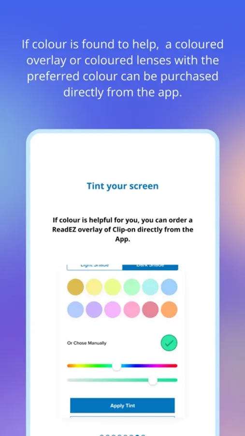 If colour is found to help, a coloured overlay or coloured lenses with the preferred colour can be purchased directly from the app.