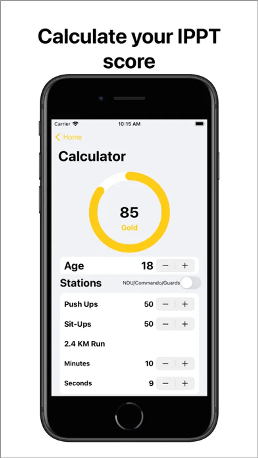 Calculate your IPPT score based on the number of push, sit-ups and your 2.4KM run timing. Scores adjust based on your age group.