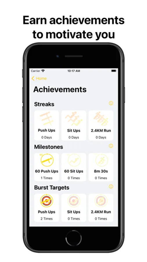 Continuously do push-ups in order to earn yourself a streak or meet the greatest number of sit-ups to earn yourself a milestone achievement! Finally achieved your 2.4KM run target? Get rewarded with a burst target achievement.
