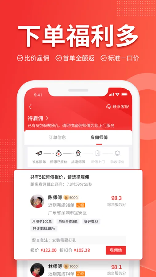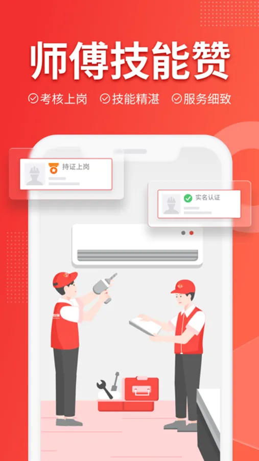1.师傅技能赞:100%实名认证,岗前层层考核筛选,技能持证上岗