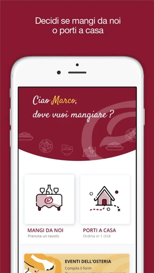 Nella App potrai ordinare piatti per ritiro presso l'Osteria o consegna a domicilio nei giorni prestabiliti, inoltre potrai prenotare un tavolo per essere sicuro di assicurarti il tuo posto.