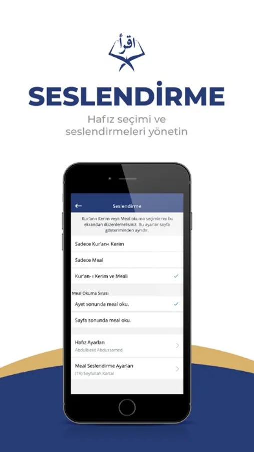 -Seslendirme: Uygulamada hafız ve meal seslendirme seçenekleri ile istediğiniz okuyucuyu seçme imkanı sunar.