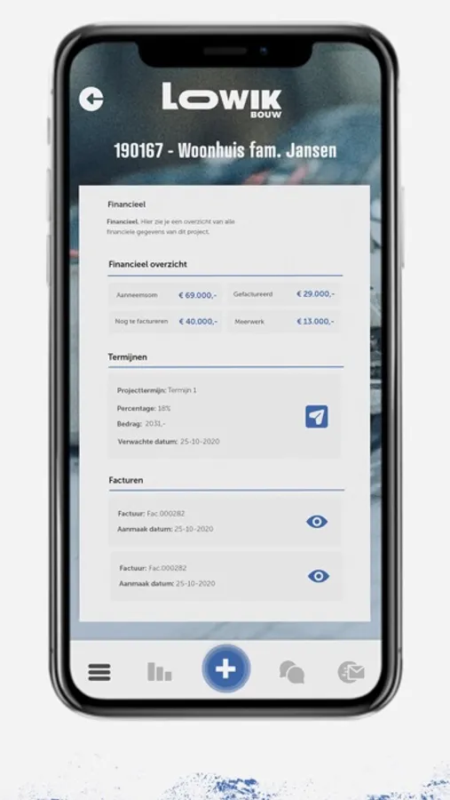 Met de Lowik Bouw app krijg je een overzicht van al jouw projecten en toegang tot realtime belangrijke project informatie. Zo ben je altijd en overal op de hoogte.