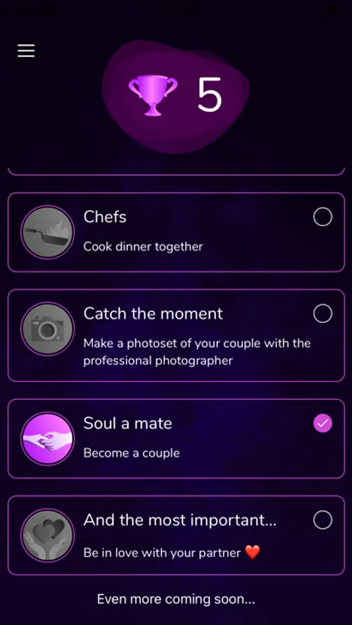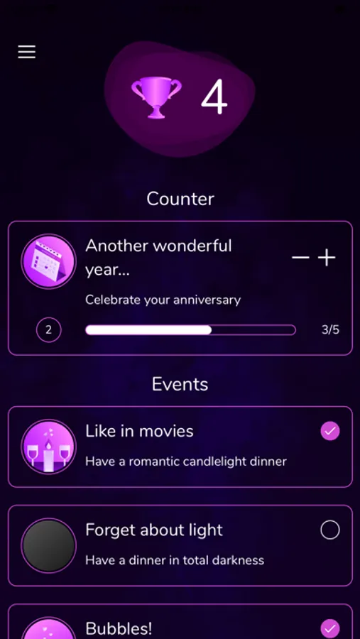 "Collector - Romantic Ideas" - the app for your romantic activities. This is a gamified source of ideas for your relationships.