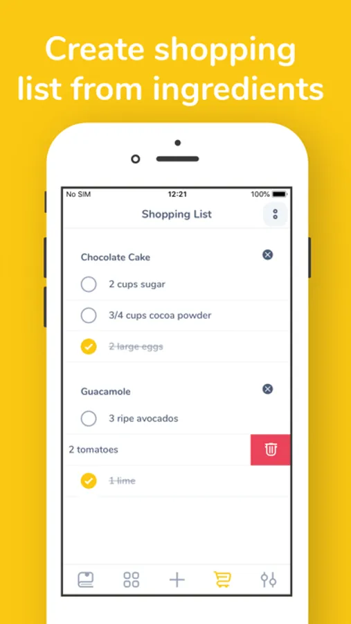 Quickly create a grocery list for all the recipes that you want to cook. Add one or the whole list of ingredients from a recipe straight to the shopping list. Cross off the items on the list as you shop.