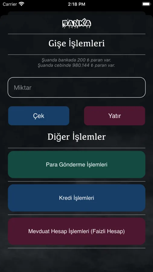 Buradan o an bankada bulunan paranızı ve cebinizde bulunan paranızı görebilirsiniz. İstediğiniz tutarı miktar yazan kutucuğa yazabilirsiniz. Daha sonra çek ve yatır kutularına tıklayarak istediğiniz miktarı bankaya yatırabilir ya da kredi olarak çekebilirsiniz. Tamamen bir bankada bulunan neredeyse her işlemi bu bölümden gerçekleştirebilirsiniz. Mevduat hesap işlemleriyle paranızı faize yatırabilirsiniz. Faizin size getirdiği para ile farklı yatırımlar yapabilirsiniz. Arkadaşınıza ya da alım yapacağınız bir envanter için banka gişe işlemlerinden para gönderebilirsiniz. Göndermek istediğiniz tutarı kutunun içine yazarak gönderebilirsiniz. Banka parasından ya da cebinizdeki nakit paradan bu tutarın teminatını gerçekleştirebilirsiniz.