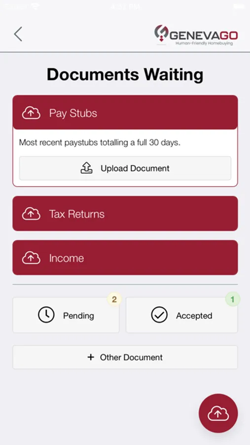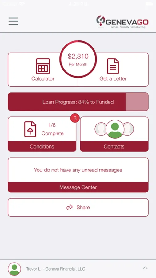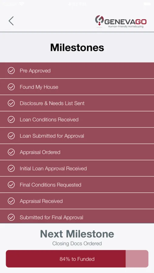 The GENEVA GO app allows all 3 parties (home buyer, loan officer, real estate agent) to track the progress of the home loan application process as the Home Buyer meets the milestones and conditions required to get final approval.