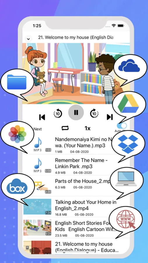- Import video, mp3 from Camera Roll, iClound, Google Driver, Box, DropBox, Computer, OneDriver