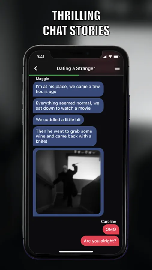 Choose your favorite category (Thriller, Horror, Mystery) and explore our library of professionally written stories full of suspense and drama. Just tap on the screen to reveal the next text message and watch the story unfold.