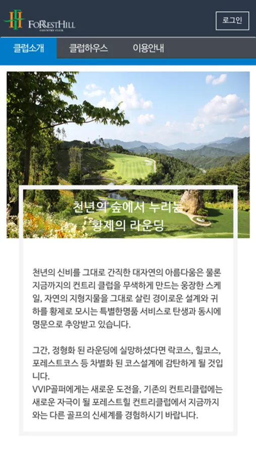 VVIP골퍼에게는 새로운 도전을, 기존의 컨트리클럽에는 새로운 자극이 될 포레스트힐 컨트리클럽에서 지금까지와는 다른 골프의 신세계를 경험하시기 바랍니다.