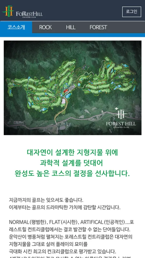 그간, 정형화 된 라운딩에 실망하셨다면 락코스, 힐코스, 포레스트코스 등 차별화 된 코스설계에 감탄하게 될 것입니다.