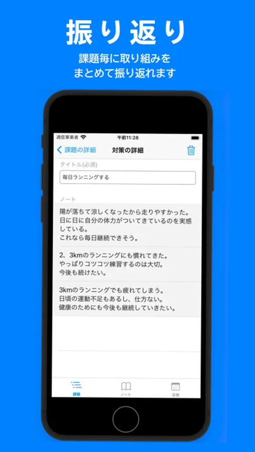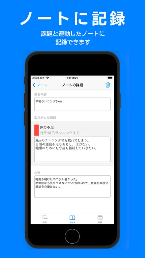 日付、天候、体調、目標、意識すること、結果、反省を記入できます。