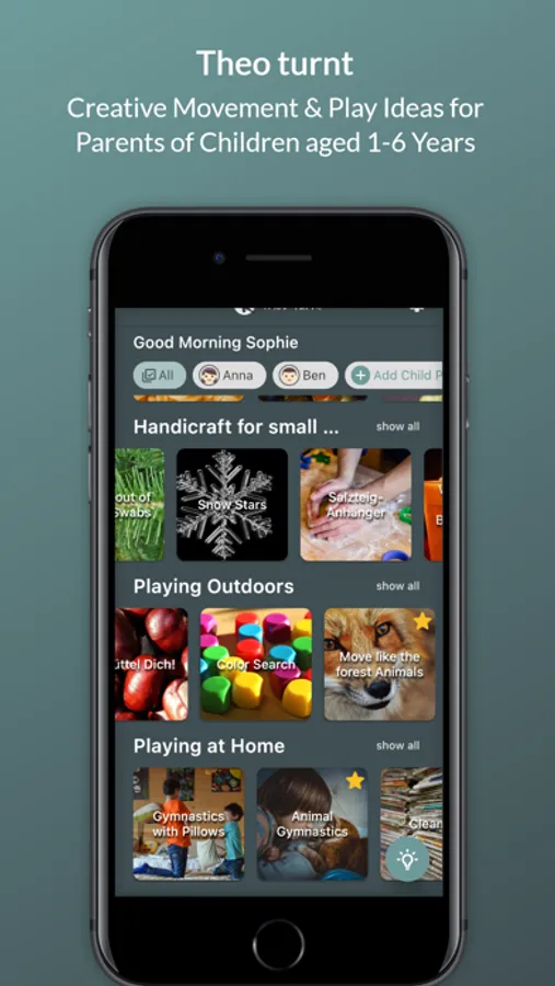 With Theo turnt, parents get a digital platform with creative movement and play ideas for their children aged 1-6. Together, these are realized with materials from nature or the home. By comparing movement competences with children of the same age, parents can preventively identify developmental deficits.
