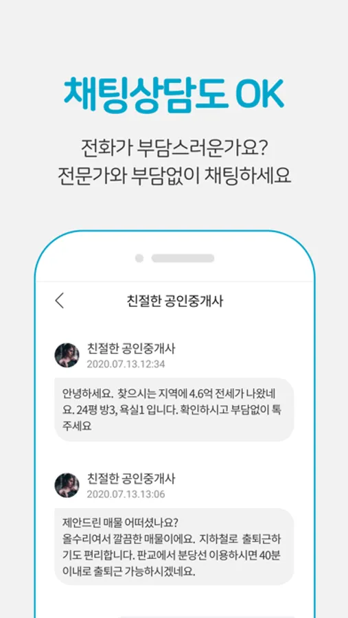 내 조건에 맞는 집을 찾아줄 중개사님에게 채팅이 도착하면, 채팅, 전화, 집찾기투어 중 나에게 맞는 방법으로 상담과 매물을 제안 받을수 있어요.