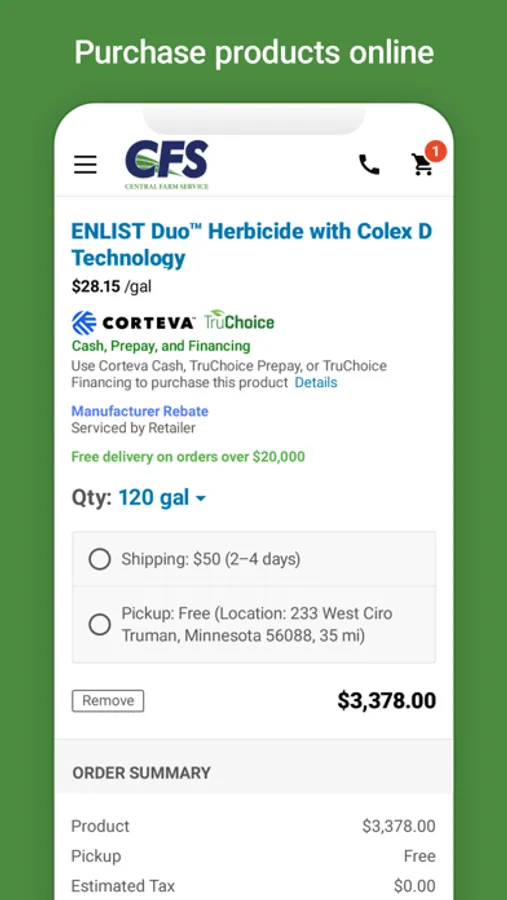 Conveniently purchase the products on your mobile device. Pay using a credit card, ACH, John Deere Financial and other options