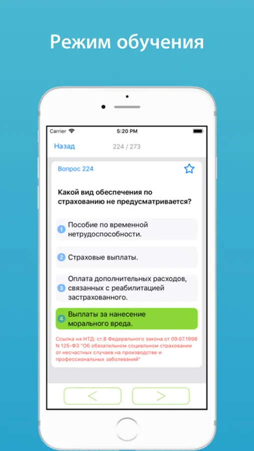 • Подготовка - Позволяет изучить вопросы в текстовом формате с отмеченными правильными ответами;
