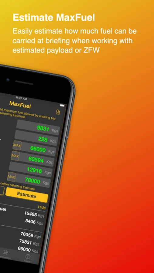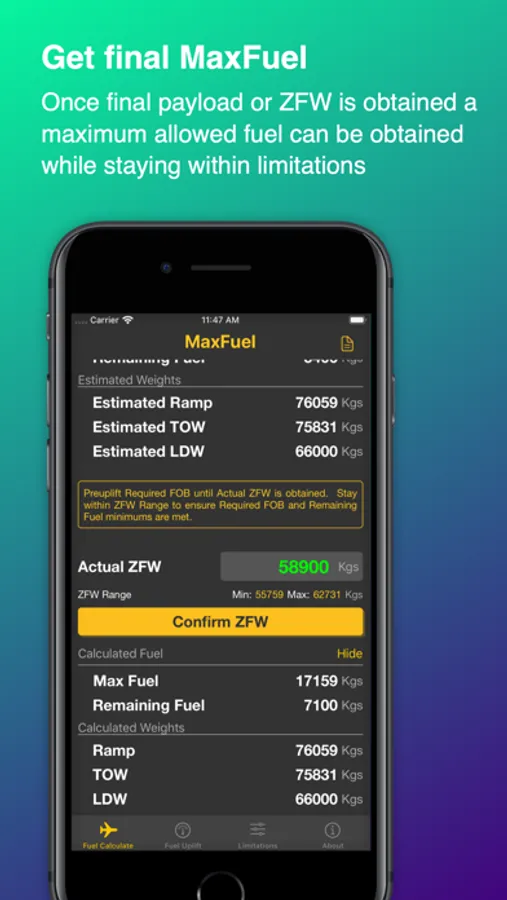 Simply input the trip details with the estimated Zero Fuel Weight (ZFW) and MaxFuel will estimate the maximum amount of fuel that can be carried. This allows the pilot to make an informed decision about desired fuel uplift until a final ZFW can be obtained and entered to calculate a final fuel amount to be uploaded. All estimated and calculated weights are checked to ensure no user-defined limitation is exceeded, allowing the pilot to get the most amount of fuel on board without going over limitations.
