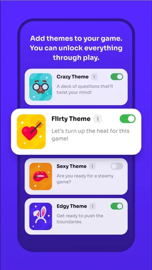 - Various themes: choose from different themes, each with a unique set of questions and challenges to add excitement and fun to your gameplay. Whether you're in the mood for a crazy night with friends, a flirty evening with your crush, or an edgy and exciting adventure, Boomit Party has a theme to suit your preferences.