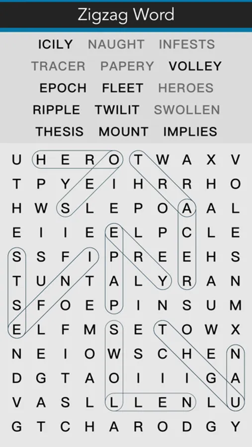 - Zigzag Word: Also known as word snake puzzles. Words on the grid have one or more angles, bends, or twists.