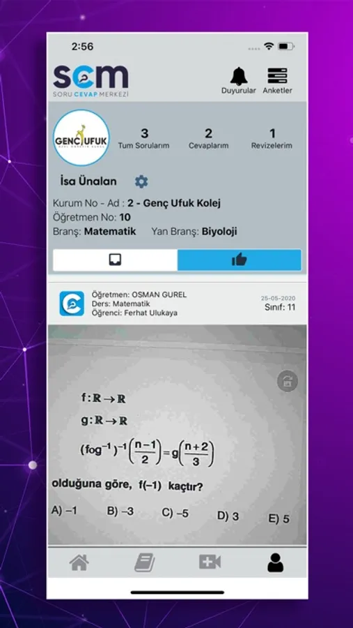 Eğitim kurumunuz tarafından kontrolü sağlanan öğrenciler ile öğretmenler arasında bilgi transferi sağlayan bir portaldır. Öğrenciler tarafından sorulacak sorulara, Öğretmenler tarafından fotoğraf, video ve açıklama ile cevap verilmesini sağlar. Genç Ufuk Koleji aracılığıyla testleri yapılan uygulamamız, eğitim kurumlarının işlerini kolaylaştırırken, öğrencilerin bilgiye hızlı ve güvenilir şekilde ulaşmasını sağlamaktadır.