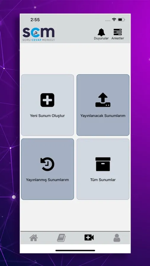 Bağlı olduğunuz kurum tarafından yapılan duyuruları görüntüleyebilir ve yapılan anketlere katılabilirsiniz.