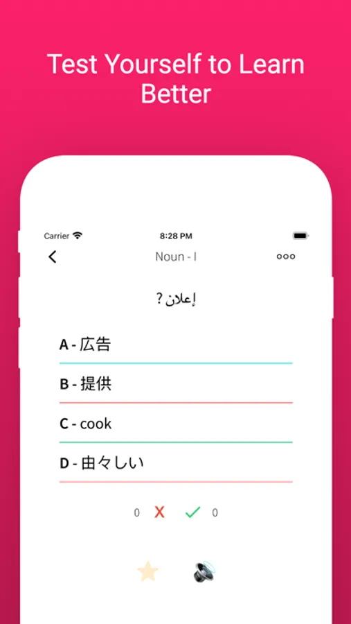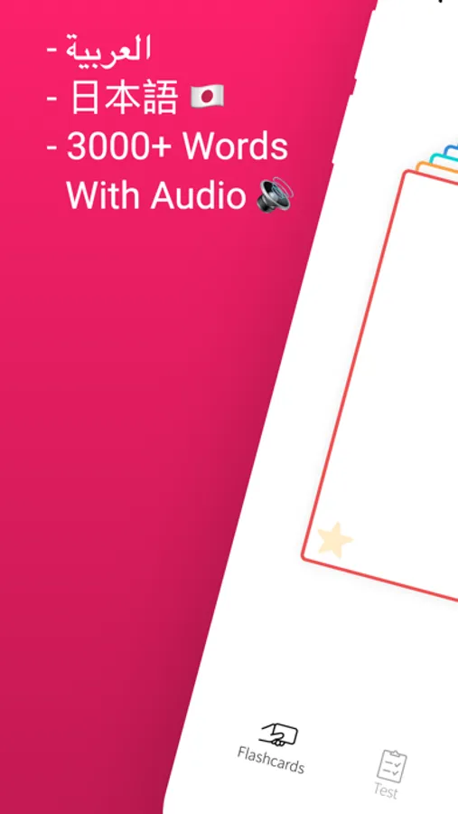 Whether you're a beginner or an advanced learner, our app offers three dynamic features to accelerate your progress: Flashcards, Word Tests, and the exciting Match Game. Start your language journey today and become a fluent communicator in both Japanese and Arabic!"