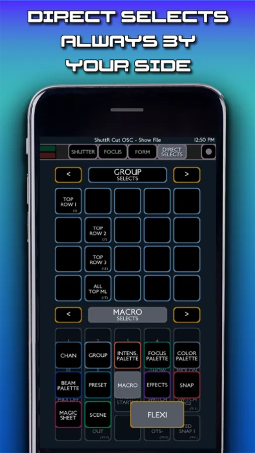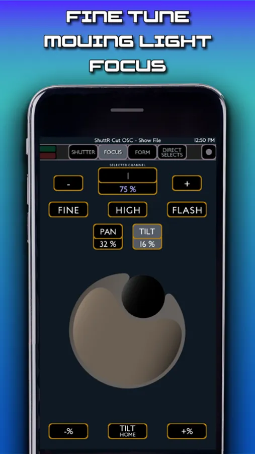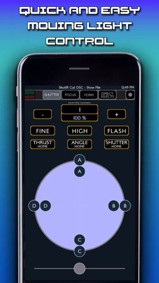 By sending and receiving open sound control packets (OSC) through TCP, the app allows feedback to see what exactly your moving lights are doing. Freeing your screen real estate for other information. The app made by lighting programmers for lighting programmers. Taking the idea of radio focus remotes (RFR) and specializing it to moving lights. Controlling intensity, shutters, focus, form, and direct selects all from one app. Meant to sit alongside while you program.