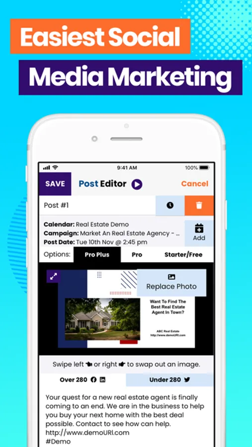 You can spend more time focusing on your business and less time learning or managing social media marketing on the fly. I'll use AI to create, manage and analyze your Facebook, Instagram, LinkedIn, and/or Twitter campaigns, 24/7.