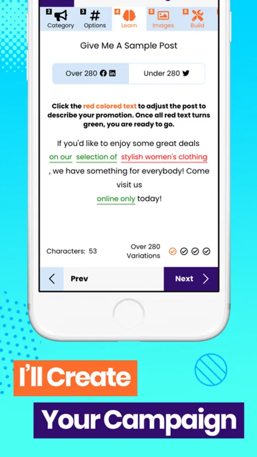 Choose your industry and campaign, tell me what you're marketing and watch your social media campaigns come to life. I will create and schedule your posts to create campaigns that last for days, weeks, or months in a matter of minutes. All you have to do is approve them.
