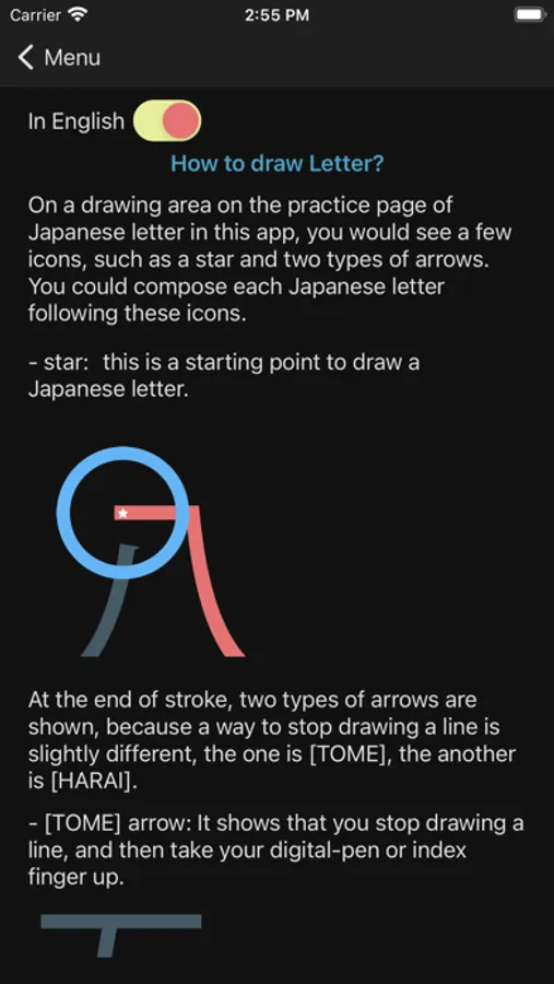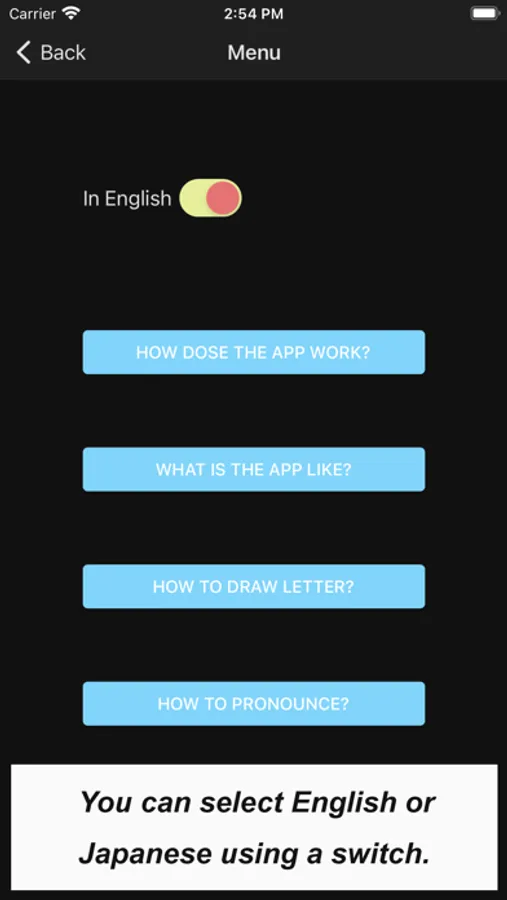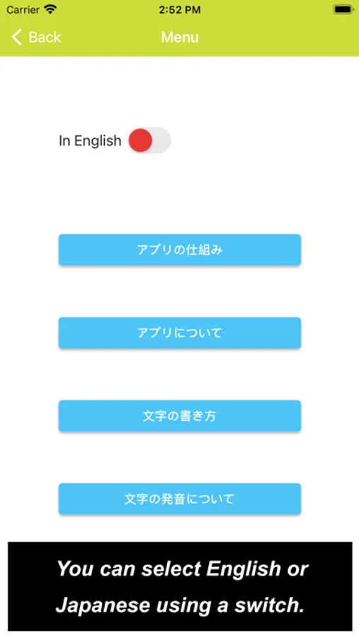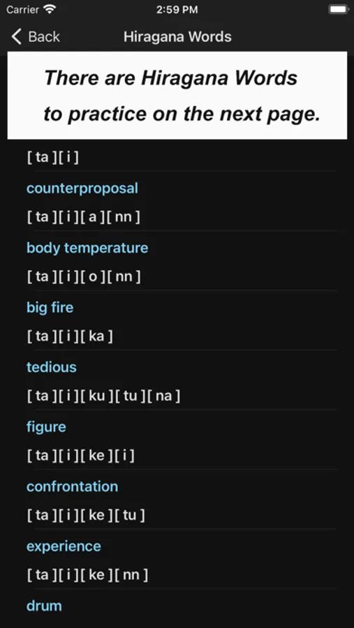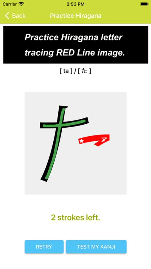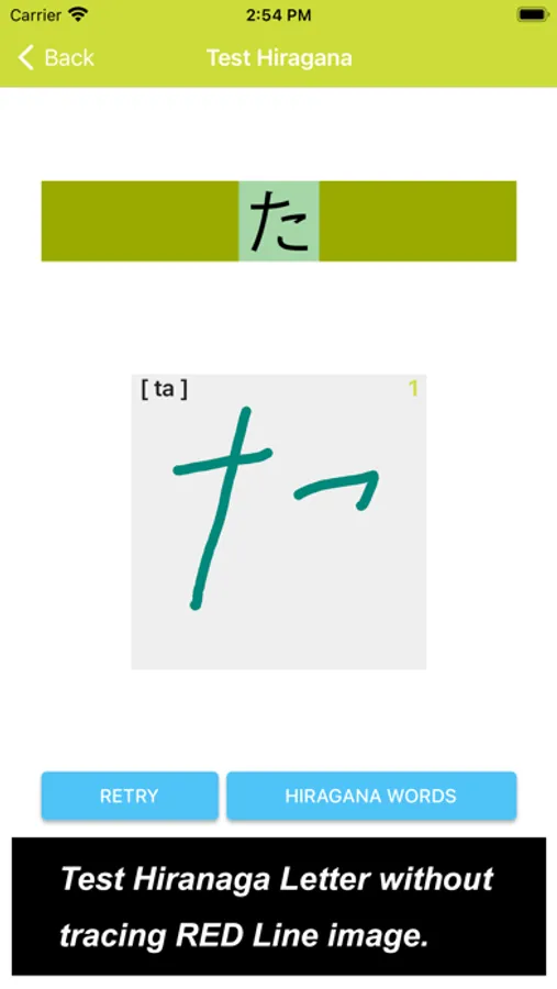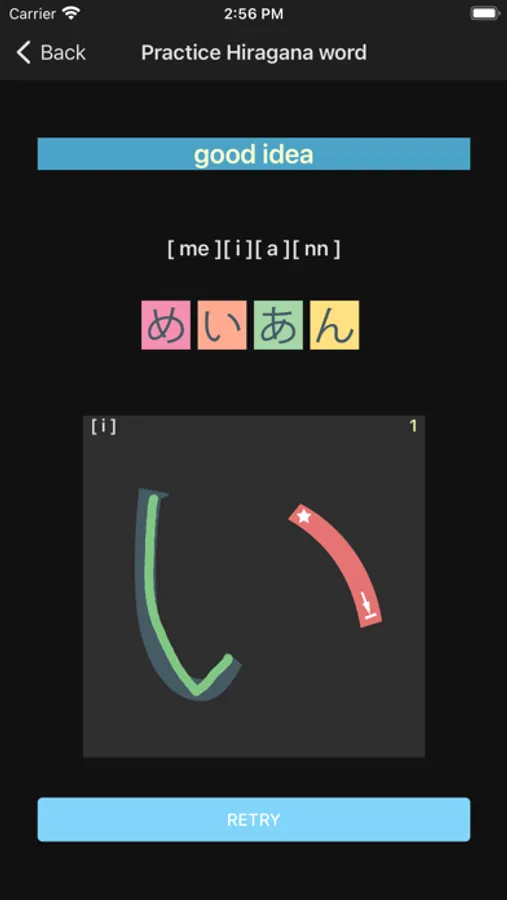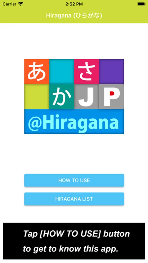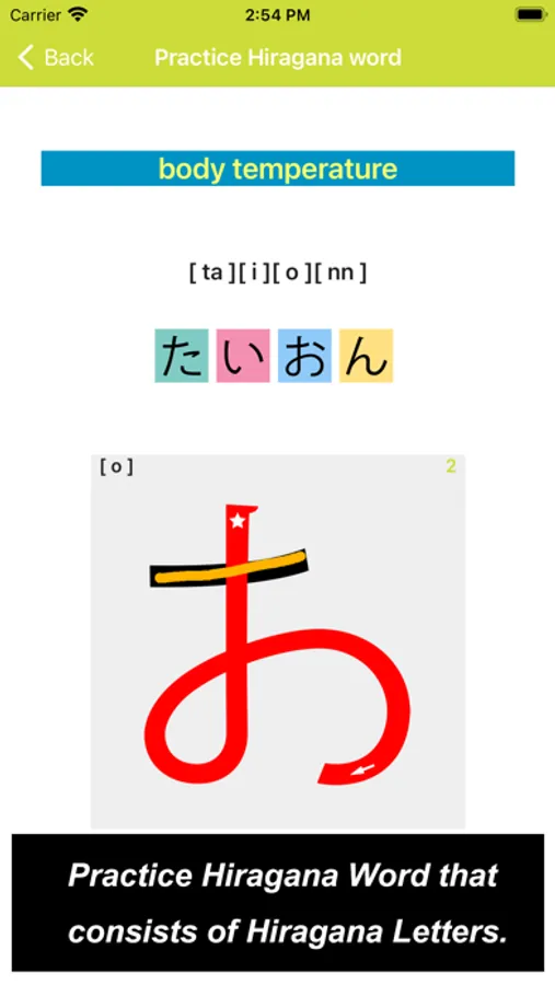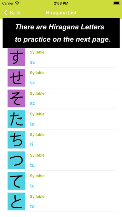 What you would see in this app is a list of Hiragana letters. If you tap one of those letters, you can practice how to draw its letter.
