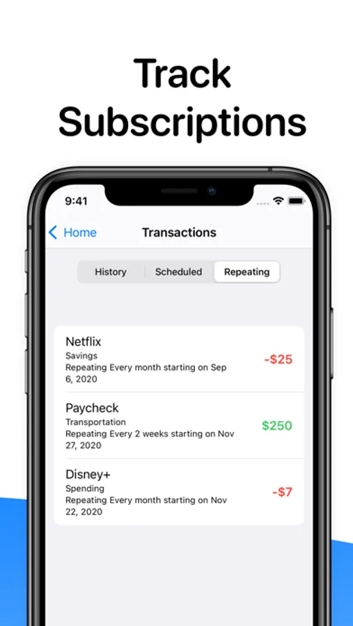 Track subscriptions and other repeating transactions with ease. Whether it’s your monthly Netflix or a once-a-year income, OpenBudget can handle it all. It’s intuitive and simple to get started for your budget, and then it just works. Let OpenBudget do all the work for you.