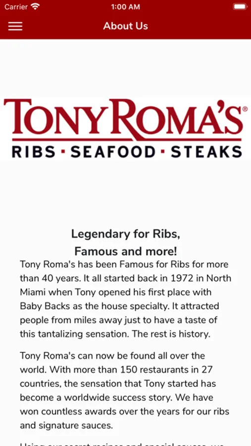 Tony Romas has been Famous for Ribs for more than 40 years. It all started back in 1972 in North Miami when Tony opened his first place with Baby Backs as the house specialty. It attracted people from miles away just to have a taste of this tantalizing sensation. The rest is history.