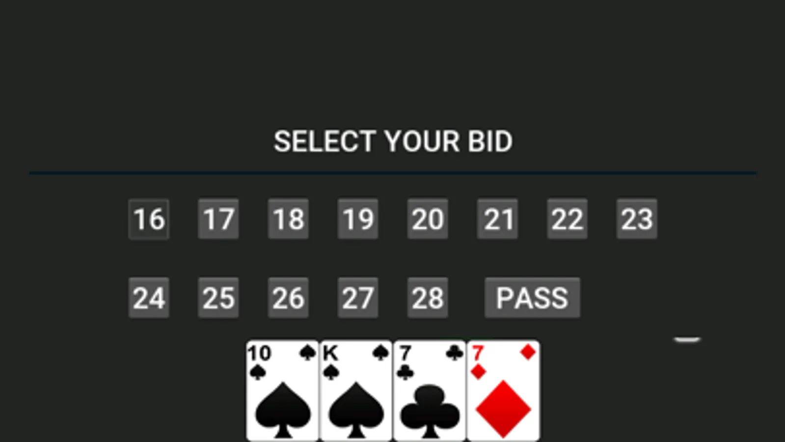 Jack (3 points), Nine (2 points), Ace (1 point) and Ten (1 point) are the only cards which have points. Thus making a total of 28 points. And Extra 1 point for last trick winner that makes a total 29 point: this total explains the name of the game. The teams need to bid and set a target for themselves and then achieve it. The player who wins the bid gets to set the trump suit thus biasing the game towards them.