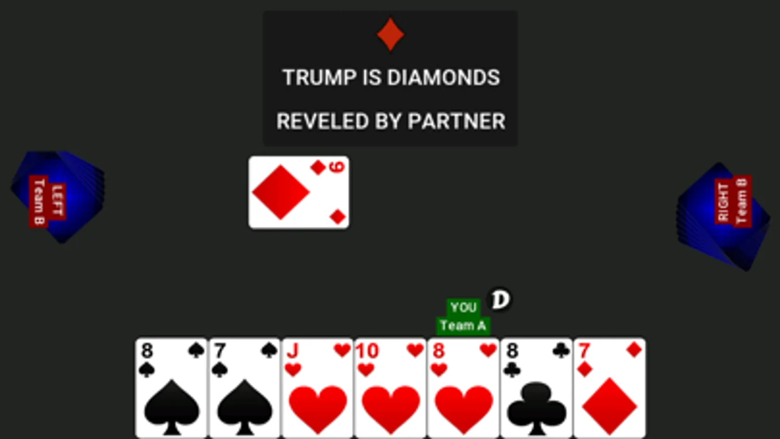 The players facing each other are partners. The game is played with 32 cards comprising of 8 cards from each suit.