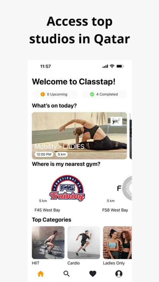 • Access the top studios and gyms in Qatar at your fingertips, including popular options like F45, FS8, Sweat by BXR, UN1T, HITFIT, Cyqlone, T23, Warrior Fit, Gymmito, VO2, Powerhouse, YallaYoga, Knockout Boxing, Life+ and beyond.