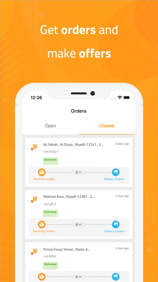 The provider can view the orders sent in the range of his presence, and provide the delivery price appropriate for him, and he can also modify the offers that was sent to clients to provide competitive offers that enable him to attract the attention of the client and gain the order and accomplish it.