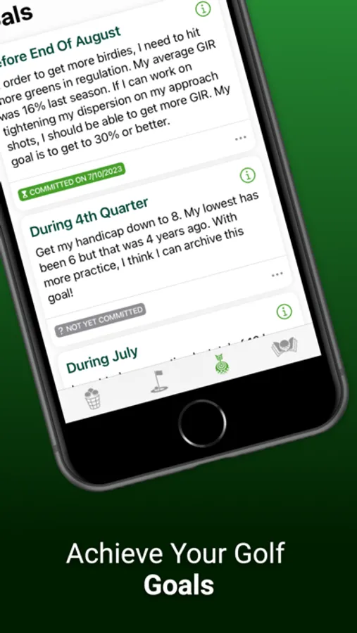 Creating goals for your yourself helps you bind to your path to improvement at a very personal level. In My Golf, you can record these goals and set deadlines for yourself. Use your goals to help you focus on creating relevant practices and obtain better scores in your games.