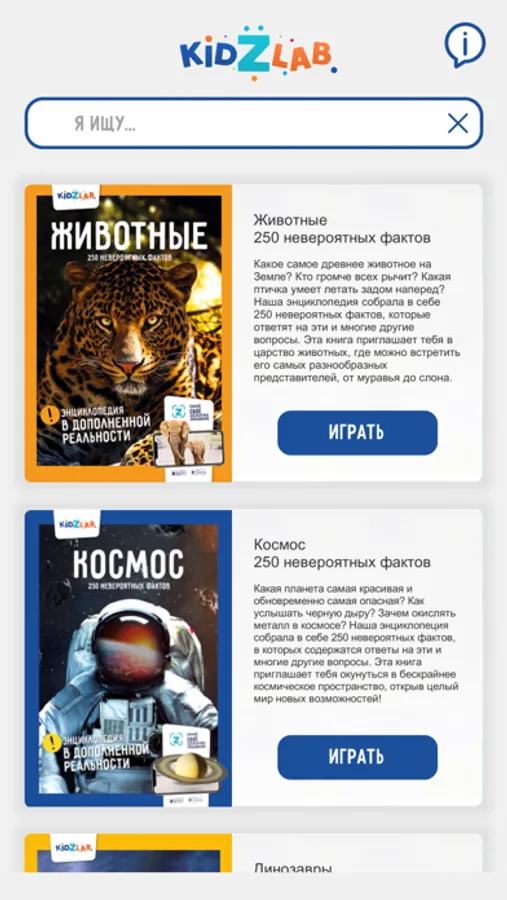 KIDZLAB - это приложение с абсолютно новым уровнем дополненной реальности, которое меняет взгляд на наш привычный мир! Оно позволяет окунуться в мир высоких технологий и открыть для себя много нового и невероятного в любом месте и в любое время! С помощью дополненной реальности Вы сможете побывать на запуске космического шаттла, полетать в открытом космосе, увидеть мир глазами животных и насекомых и встретиться с реальными динозаврами! Море эмоций гарантировано!