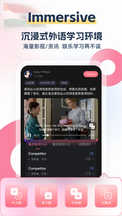 【沉浸式外语学习环境】软件根据母语学习法,建有听、说、读、写板块。精彩呈现全球每日外文资讯;影视短片、经典欧美电影,中英文字幕4档随心切换,播放倍速任意调;海量国外真人vlog;世界各地真人语伴交流。