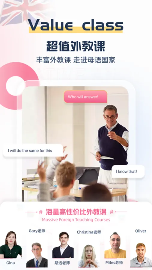 【超值外教课】丰富的外教课程,带你走进母语国家的地道英语。风趣幽默,口音纯正,更有丰富的针对中国英语学习者的教学经验。