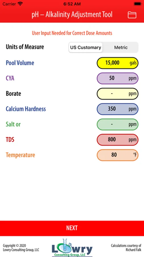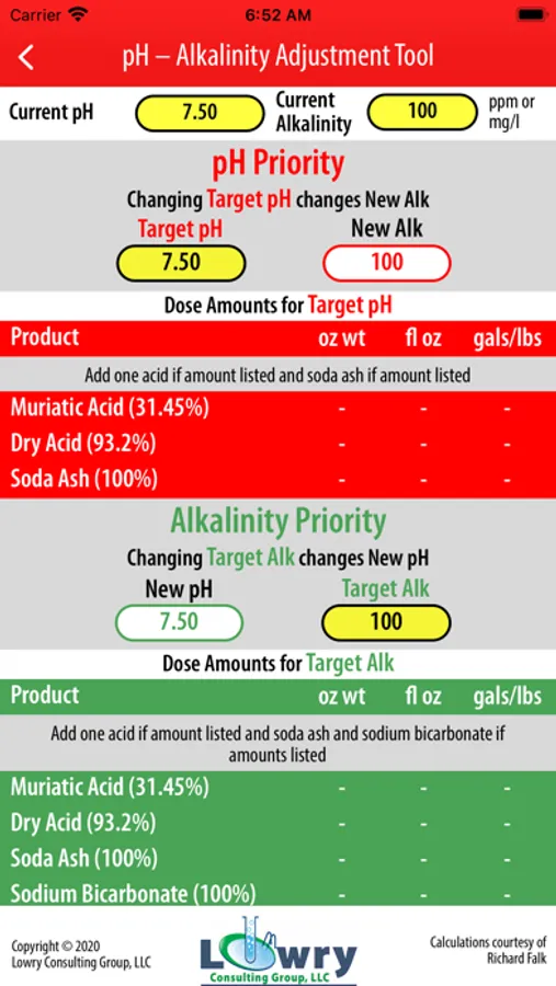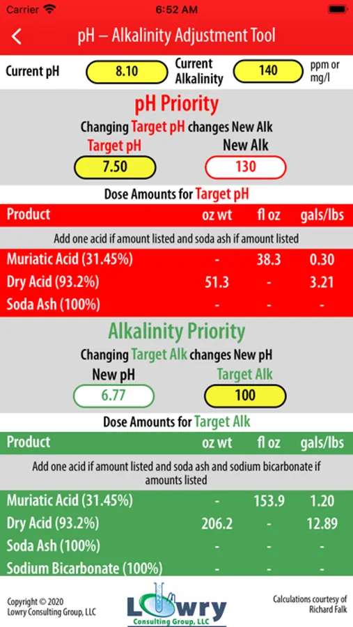 You enter Pool Volume and levels for CYA, Borate, Calcium Hardness, Salt or TDS, and Temperature on the first screen. Then on the second screen, you enter Current pH and Current Alk in the yellow cells near the top and then enter Target pH in the yellow cell in the red pH Priority Section and Target Alkalinity in the yellow cell in the green Alkalinity Priority section. You instantly see the chemical amounts needed for obtaining either pH Priority (red section) or Alkalinity Priority (green section).