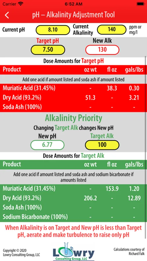 The pH – Alkalinity Adjustment Tool works for any current or starting pH and alkalinity, any CYA, any borate, any calcium hardness, any TDS, any temperature with any Target pH or alkalinity, and it works for raising or lowering both with an accuracy of 0.01. It is also much more accurate than the Pool Acid Dose Calculator because it uses all sources of hydrogen ion (H+) in the water.