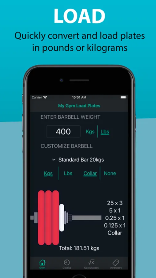 Add new gyms and customize the inventory for each. In addition to the standard inventory, you can add your own plates, barbells and collars with the exact weight that you need.