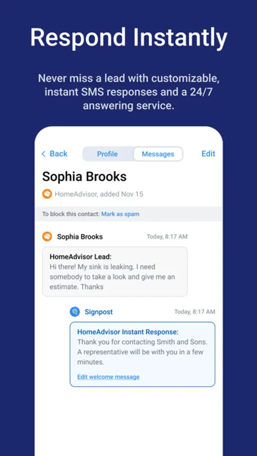 Signpost helps home service businesses respond to leads, simplify communication, and build a credible online reputation. 78% of jobs go to the business that responds first. Convert more leads by responding instantly with custom text messages. Provide a better customer experience with the Signpost app by effectively communicating with customers throughout the duration of the project from one messaging hub. Signpost users can answer business inquiries, confirm appointments, and share images. Send review requests in seconds from the Signpost app after a job well done to take your online reputation to the next level. Each contact will have a comprehensive history within their profile, painting a full picture of that customer's journey with your business.