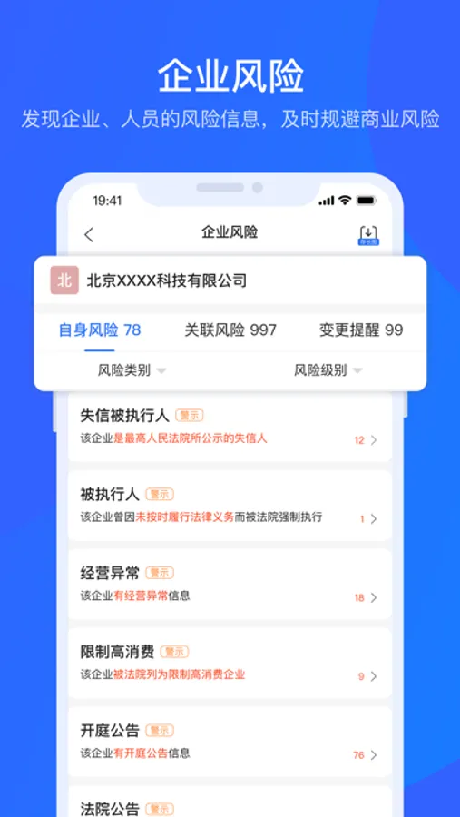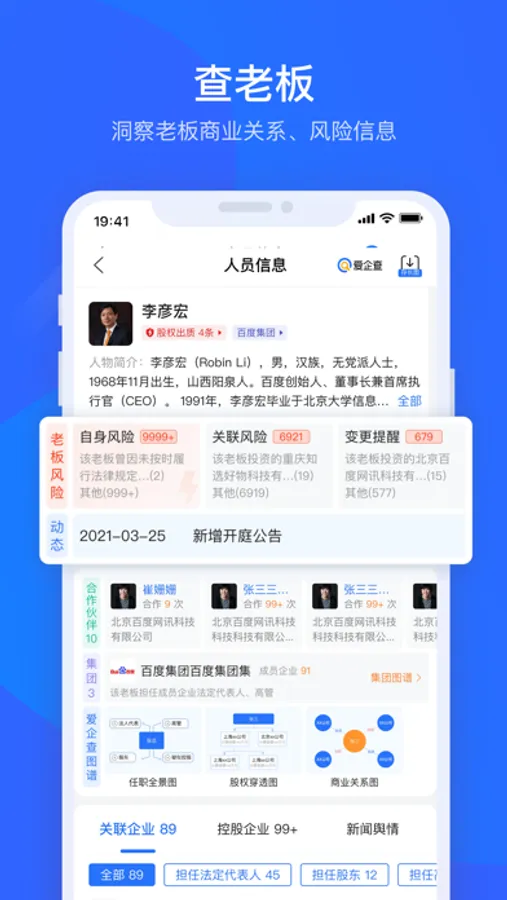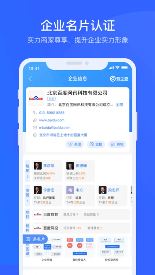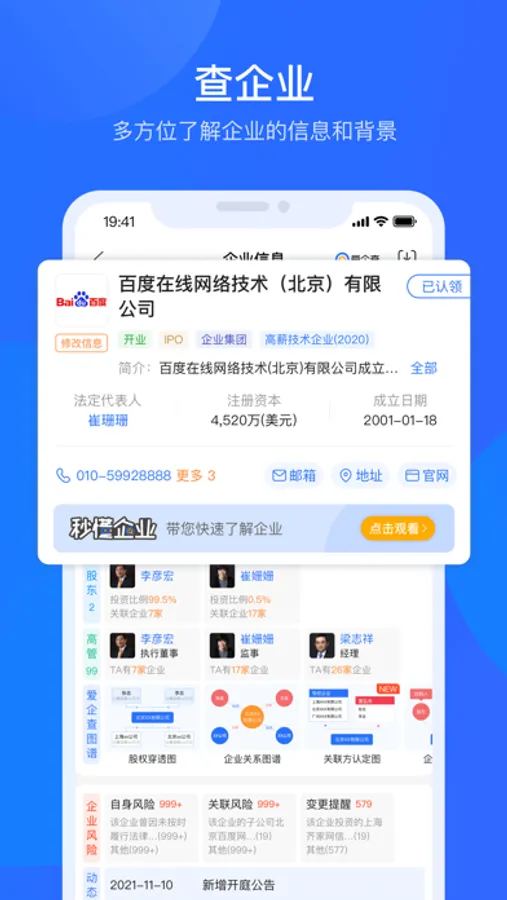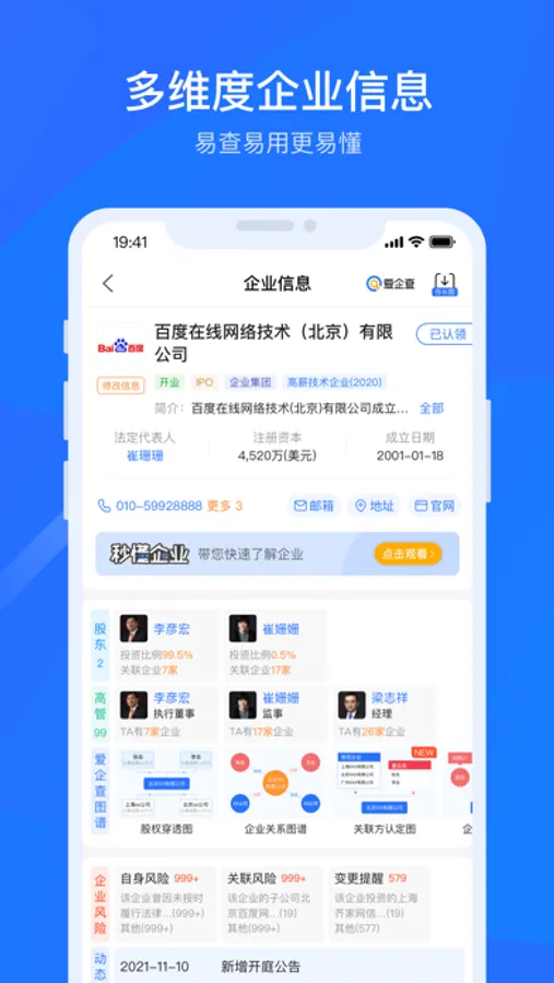 【产品功能】查企业、查老板、查老赖、查商标、查地图等多项查询服务免费使用;为用户提供最大便捷;