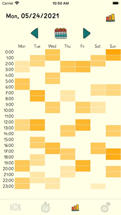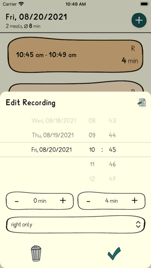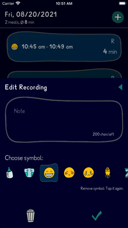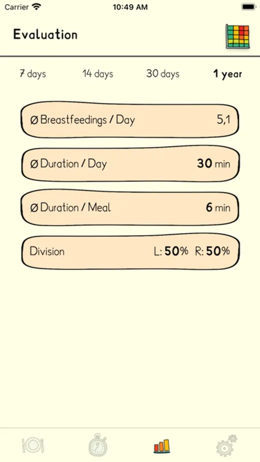 Recordings can be fixed or added any time later if you forgot to track your session. There's also a little evaluation which shows interesting data. The week heatmap lets you forecast the next time your baby wants to have a meal.